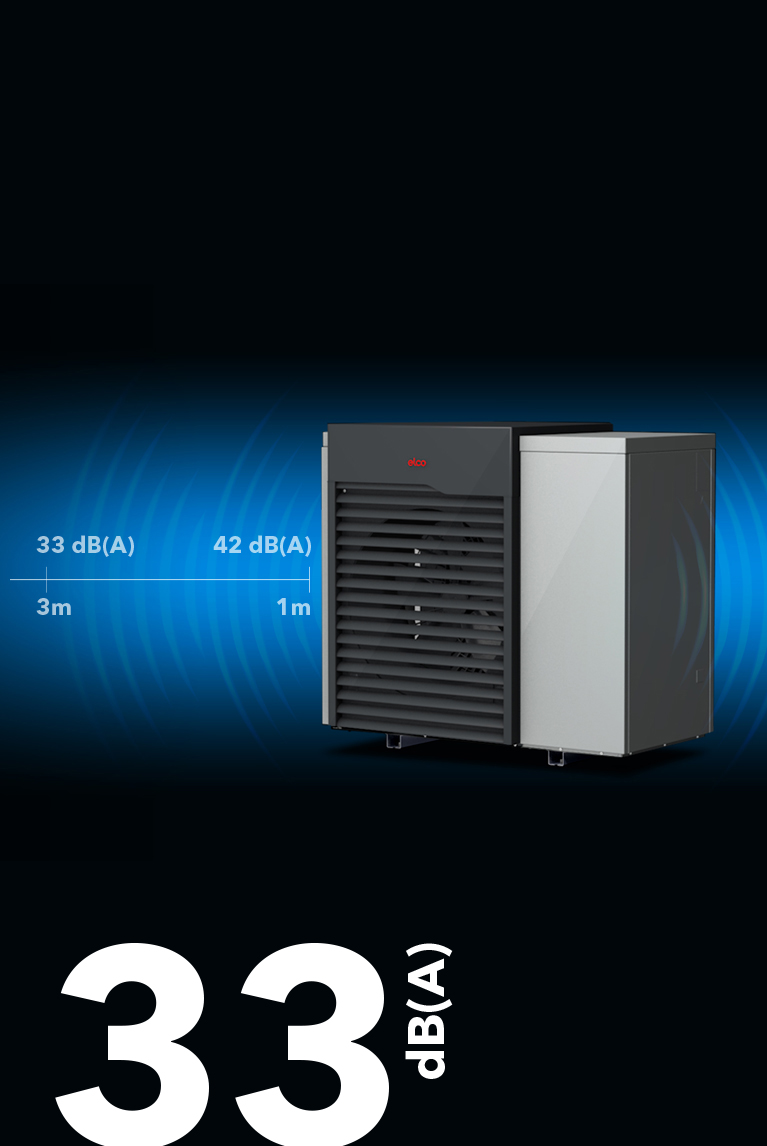 Mit einem Schalldruck von 33 dB(A) in 3 Metern Abstand ist die AEROTOP SX von ELCO kaum lauter als Flüstergeräusche und damit eine der leisesten Wärmepumpen ihrer Klasse. Das macht sie zur geeigneten Lösung auch in dicht bebauten Wohngebieten.