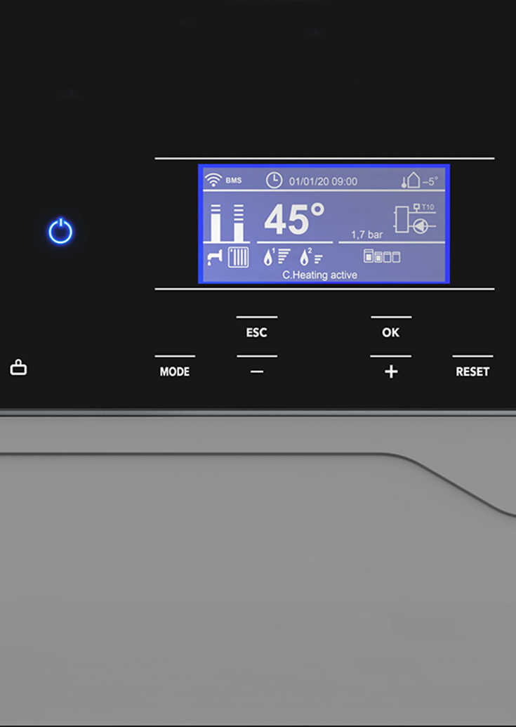 Die HMI befindet sich im oberen Bereich des Geräts, auf einer Höhe von 1,70 m. Unabhängig davon, ob es sich um eine Konfiguration mit Kaskade oder mit einem einzelnen Heizkessel handelt. Dadurch werden Installation, Wartung und Bedienung deutlich vereinfacht.